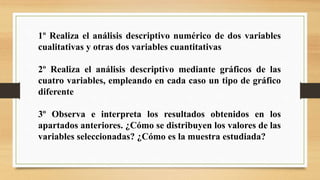 El documento instruye realizar un análisis estadístico descriptivo de 4 variables, 2 cualitativas y 2 cuantitativas, de un conjunto de datos de salud. Se debe hacer un análisis numérico y gráfico de cada variable, usando distribuciones de frecuencias y gráficos de barras para las cualitativas, y resúmenes numéricos e histograma/diagrama de cajas para las cuantitativas. Finalmente, se debe interpretar los resultados para describir la distribución de valores y características de la muestra