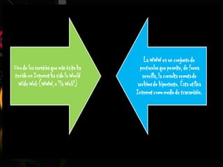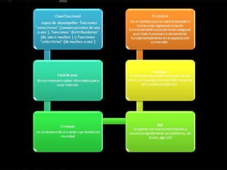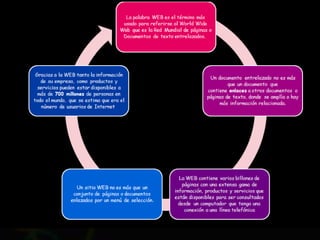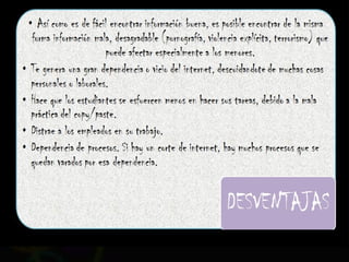 Este documento presenta los objetivos, resumen y conclusiones de un proyecto sobre Internet. Los objetivos son saber más sobre Internet, conocer sus características, ventajas y desventajas. Las conclusiones son que Internet se ha convertido en un importante método de comunicación y ha facilitado que las personas estén informadas y se desarrollen.