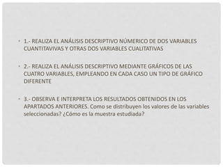 Este documento presenta el análisis estadístico descriptivo de cuatro variables, dos cualitativas (dulces y cerveza) y dos cuantitativas (peso y altura), para una muestra de personas. Se realiza un análisis numérico y mediante gráficos de cada variable, y se interpretan los resultados obtenidos.
