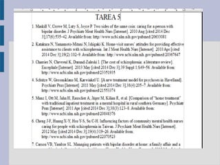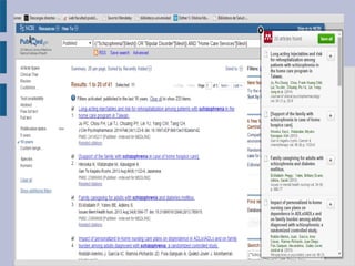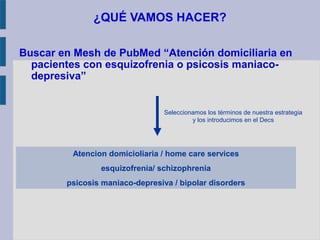 Este documento describe los pasos para realizar una búsqueda de información en la base de datos PubMed sobre la atención domiciliaria de pacientes con esquizofrenia o trastorno bipolar. Incluye seleccionar los términos médicos apropiados en MeSH, ejecutar la búsqueda en PubMed, limitar los resultados a los últimos 10 años y guardar los resultados en Mendeley para su gestión bibliográfica. También explica cómo localizar el texto completo de un artículo específico a través del catálogo de la biblioteca.