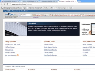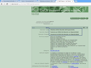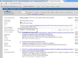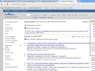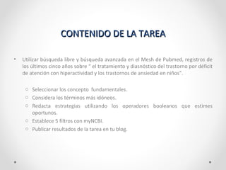 Este documento describe una tarea para buscar información sobre el tratamiento y diagnóstico del trastorno por déficit de atención con hiperactividad y los trastornos de ansiedad en niños en la base de datos PubMed. La tarea incluye realizar búsquedas libres y avanzadas en MeSH de PubMed, seleccionar conceptos clave, usar operadores booleanos, establecer 5 filtros con myNCBI, y publicar los resultados en un blog.