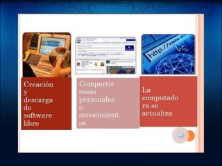 Este documento resume cómo se creó Internet, sus características más importantes como las ventajas y desventajas para los usuarios, y las aplicaciones de la web 2.0. Explora el origen de Internet, los beneficios y limitaciones para las personas, y las herramientas interactivas en la web.