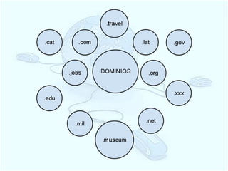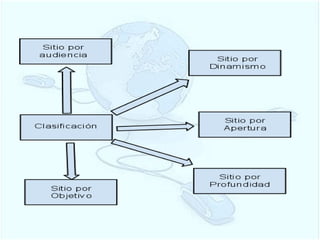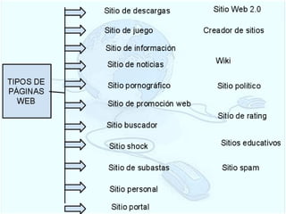 Este documento resume los tipos de páginas web, la clasificación de las páginas, los dominios de internet y el costo para alojar una página web. Explica que existen sitios de archivo, directorio, empresa, blog, desarrollo, base de datos y comunidad virtual. Además, detalla que el costo anual para un plan estándar es de $105 dólares y de $119.94 para 6 meses en un plan gold.