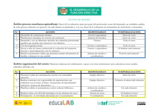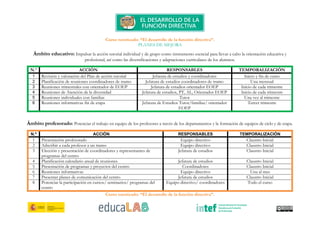 Este documento presenta los planes de mejora para un curso tutorizado sobre el desarrollo de la función directiva. Incluye acciones para mejorar la orientación educativa y profesional de los estudiantes, el trabajo en equipo del profesorado, los procesos de enseñanza-aprendizaje, las relaciones con otras instituciones, las familias y la gestión de recursos. Detalla las acciones, los responsables y la temporalización para cada ámbito.