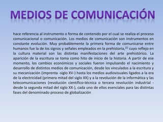 Este documento describe la evolución de los medios de comunicación a través de la historia, desde las primeras formas de comunicación en la prehistoria hasta los medios modernos como la televisión, internet, radio, teléfono y periódico. Explica que cada nuevo medio surgió como resultado de cambios sociales y económicos y fue fundamental para la globalización. Luego define y describe brevemente cada uno de los principales medios de comunicación modernos.