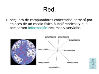 El documento define varios términos relacionados con la tecnología de la información y las comunicaciones. Una red es un conjunto de computadoras conectadas que comparten información y recursos. Un programa es una secuencia de instrucciones que una computadora puede interpretar y ejecutar. Un blog es un sitio web actualizado periódicamente con artículos de uno o más autores. RSS permite compartir información de sitios web frecuentemente actualizados. YouTube es un sitio web que recopila videos. Un wiki permite que varios usuarios editen colaborativ