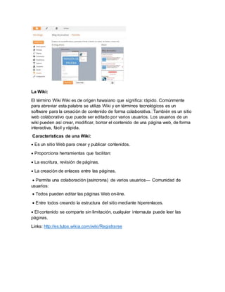 Este documento describe varias herramientas de la Web 2.0 como blogs, wikis, Google Drive, YouTube, SlideShare y redes sociales. Explica las características y usos de cada herramienta y proporciona enlaces a sitios web relacionados. También incluye descripciones de herramientas para crear mapas mentales, etiquetas y nubes de palabras.