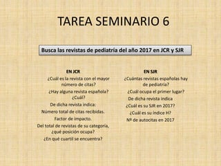Este documento presenta los pasos para completar una tarea de seminario sobre el análisis y comparación de revistas de pediatría en las bases de datos JCR y SJR. La tarea incluye identificar la revista más citada en JCR, verificar si hay revistas españolas y recopilar métricas como citas, factor de impacto y posición de cuartiles. En SJR, la tarea es contar revistas españolas, identificar la de mayor puntaje SJR, y recopilar datos como SJR, H-index y autocitas de la rev