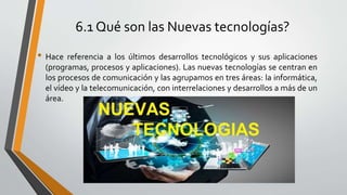 El documento aborda las nuevas tecnologías, definiéndolas como desarrollos recientes en comunicación, organizadas en informática, video y telecomunicaciones. Se destacan sus características, como inmaterialidad y diversidad, y se discuten sus aplicaciones en educación, enfatizando la necesidad de integrar estas tecnologías en el currículo y la enseñanza. Además, se resalta el papel de Internet y la Web 2.0 como herramientas clave para mejorar el acceso a la información y enriquecer la experiencia educativa.