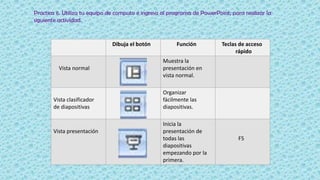 El documento describe las tres vistas principales en PowerPoint: la vista normal, la vista clasificadora de diapositivas y la vista de presentación. Cada vista tiene una función específica y teclas de acceso rápido asociadas para organizar y presentar fácilmente las diapositivas de una presentación de PowerPoint.