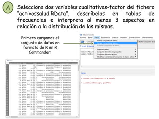 Este documento instruye al lector sobre cómo analizar y resumir datos cualitativos y cuantitativos de un conjunto de datos llamado "activossalud.RData" utilizando el software R. Instruye al lector sobre cómo generar tablas de frecuencias para variables cualitativas, resúmenes numéricos para variables cuantitativas, y varios tipos de gráficos. Luego, el documento proporciona ejemplos de cómo analizar y resumir dos variables cualitativas y dos variables cuantitativas del conjunto de datos.