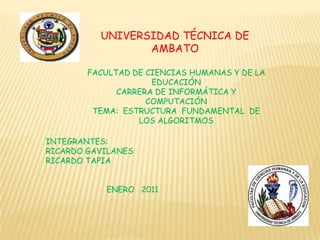El documento describe las estructuras fundamentales de los algoritmos, incluyendo estructuras secuenciales, de decisión, de caso y repetitivas. Explica los componentes clave de un algoritmo como datos de entrada, proceso y datos de salida. También cubre conceptos como asignación interna, asignación externa y actualización de datos, y proporciona ejemplos de algoritmos secuenciales y fórmulas para calcular porcentajes.