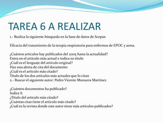 Este documento resume los resultados de una búsqueda en la base de datos Scopus sobre la eficacia del tratamiento de la terapia respiratoria para pacientes con EPOC y asma. Se analizan 94 artículos publicados desde 2005 hasta la actualidad. También se revisa la información de un autor específico, Pedro Vicente Munuera Martínez, incluyendo el número de sus publicaciones, su índice h, y el artículo y revista más citados.