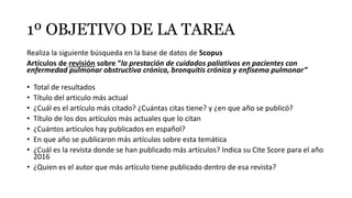 Este documento describe dos tareas de búsqueda en la base de datos Scopus. La primera tarea involucra realizar varias búsquedas y recopilar métricas sobre artículos de revisión sobre cuidados paliativos en pacientes con enfermedades pulmonares obstructivas crónicas. La segunda tarea implica buscar información sobre el autor Pedro Vicente Munuera Martínez, incluido el número de documentos publicados, su índice h, el artículo más citado y la revista con más publicaciones del autor. El documento proporciona instrucciones