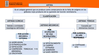 El documento clasifica los tipos de asfixia en asfixias clínicas, mecánicas y tóxicas. Las asfixias mecánicas se producen por acción mecánica externa u ocupación de las vías respiratorias, e incluyen ahorcadura, estrangulación, sofocación, compresión torácica o abdominal, crucifixión, sepultamiento y cuerpos extraños.