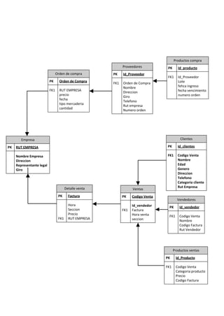 Este documento presenta diagramas de entidad-relación que modelan las relaciones entre las entidades de una empresa, sus proveedores, productos, clientes y ventas. Se describen las tablas principales y las claves primarias y foráneas que vinculan las tablas entre sí para representar los procesos comerciales de la compra de productos, venta a clientes y detalles de las transacciones.