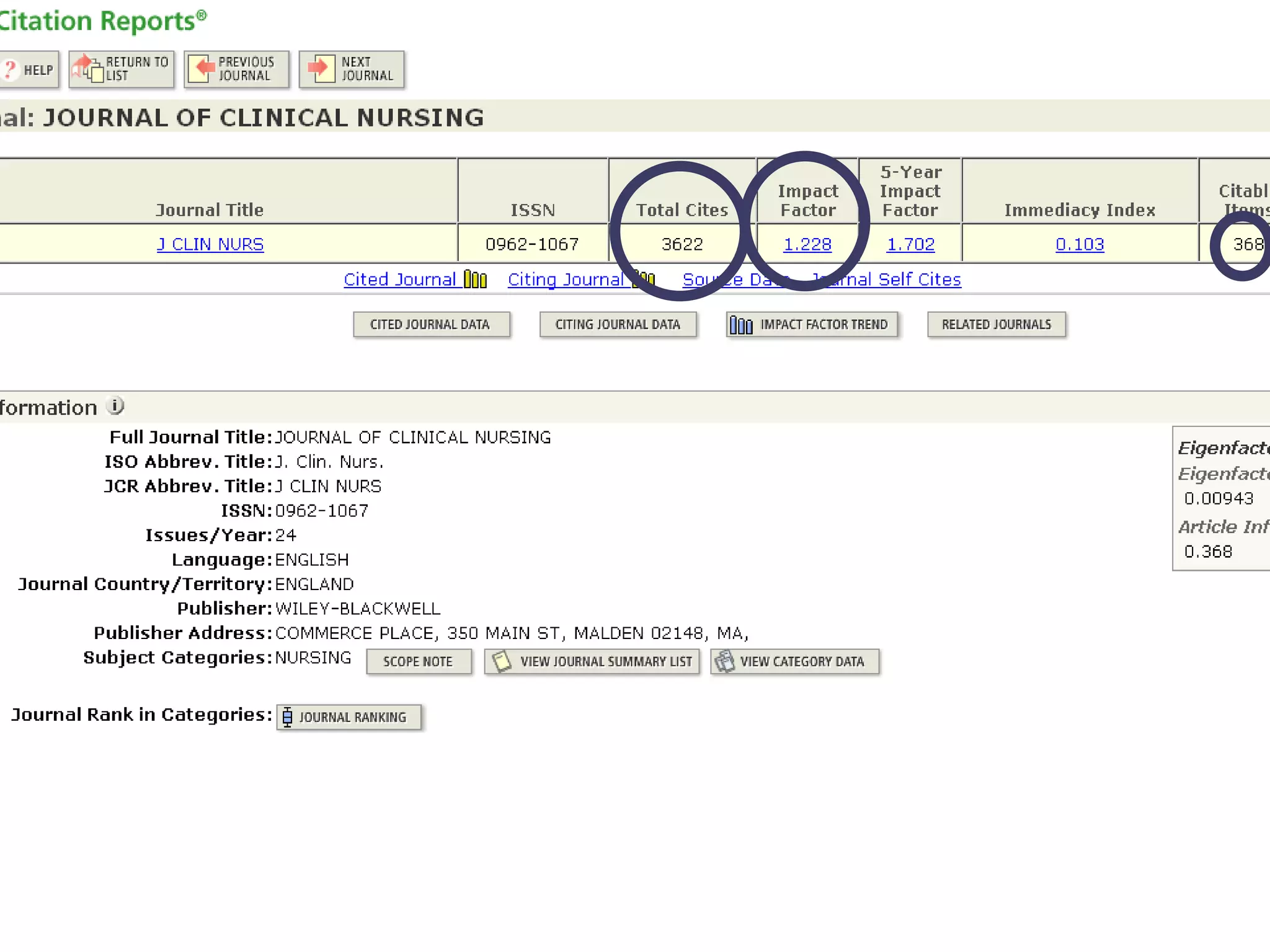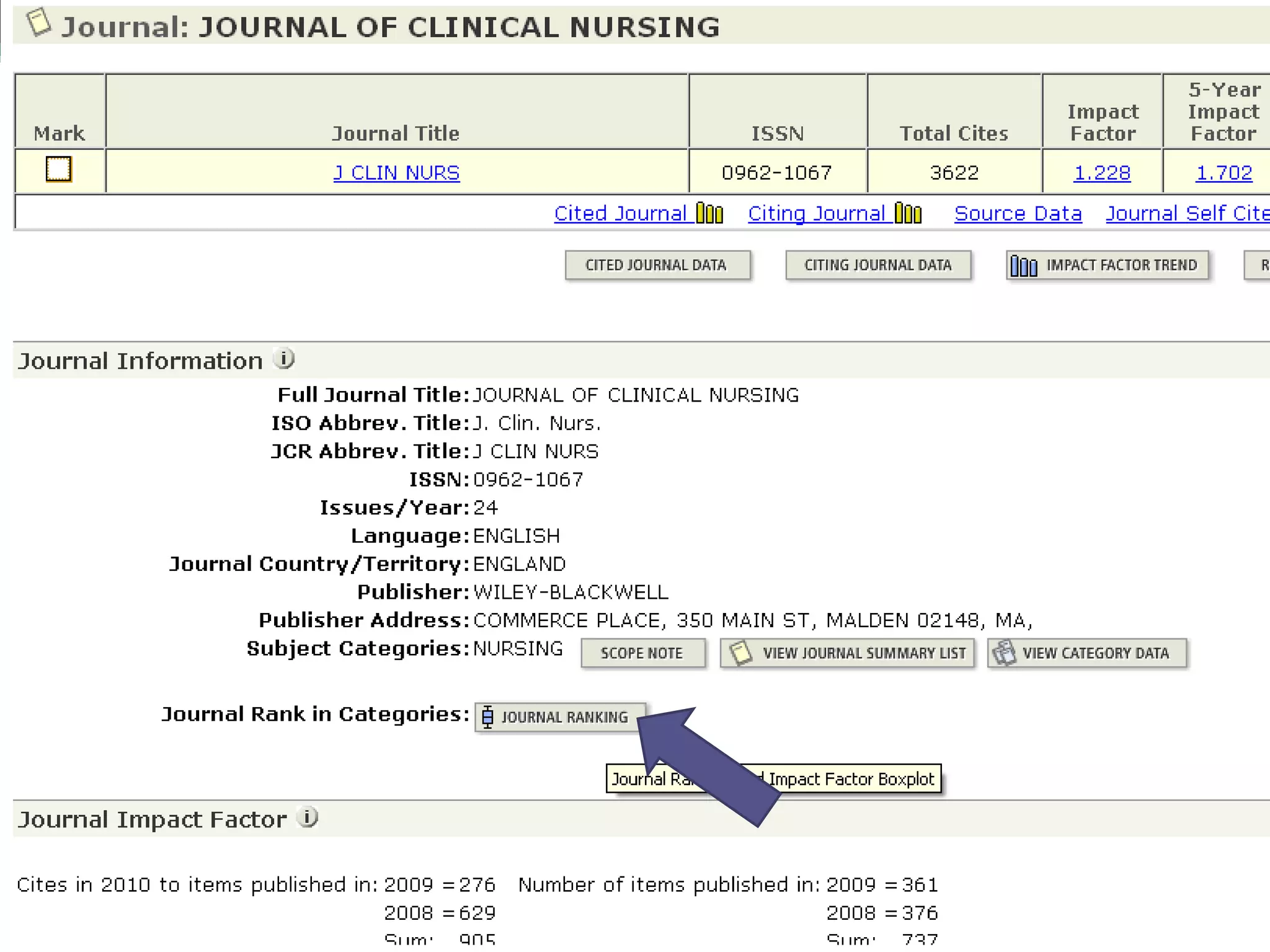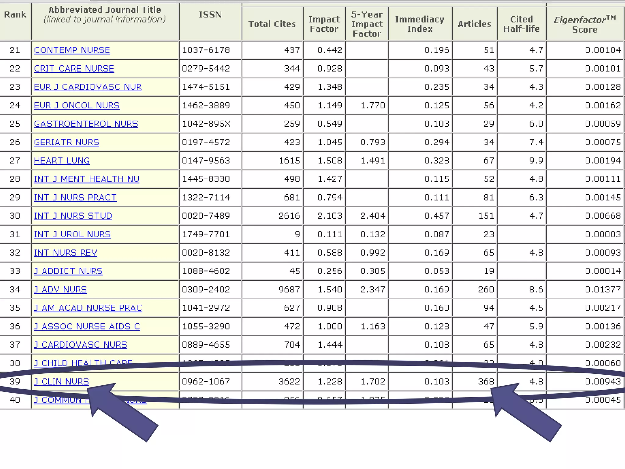La revista Journal of clinical nursing publicó el mayor número de artículos (368) en 2010 de todas las revistas de Enfermería. Esta revista recibió 3,622 citas en total, tuvo un Factor de Impacto de 1.228, e índice de Inmediatez de 0.103. Dentro de su categoría, Journal of clinical nursing se ubicó en el cuartil 2 y ocupó el puesto 26 de 89 revistas.