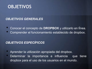 Este documento describe el funcionamiento de Dropbox. Dropbox permite sincronizar archivos entre dispositivos a través de Internet, creando una copia en la nube que puede accederse desde cualquier lugar. Los usuarios pueden compartir archivos y carpetas, y Dropbox ofrece diferentes planes de almacenamiento, desde gratuito hasta planes pagos con más espacio. La sincronización se realiza de forma encriptada para mantener la seguridad de los archivos en la nube.