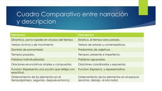El documento presenta un cuadro comparativo entre la narración y la descripción. La narración se caracteriza por ser dinámica y usar verbos activos, tiempos pasados, y oraciones que representan una acción en el tiempo. La descripción es estática, usa verbos de estado y tiempos presentes, y ordena los elementos en el espacio a través de adjetivos y oraciones coordinadas.