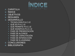 La tecnología PACIE (Presencia, Alcance, Capacitación, Interacción y E-learning) es un método educativo que utiliza recursos tecnológicos para mejorar el proceso de enseñanza y aprendizaje. Se basa en principios como aprender haciendo y aprender creando. Incluye cinco fases: presentación de contenidos, planificación del alcance virtual, capacitación docente, interacción en línea y evaluación a distancia.