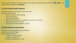 El documento resume los resultados de buscar las revistas de pediatría del año 2016 en las bases de datos JCR y SJR. En JCR, la revista con mayor número de citas es Pediatrics, con 73,380 citas totales y un factor de impacto de 5.705. Ocupa la tercera posición de 121 revistas y se encuentra en el cuartil Q1. En España la revista de pediatría es Anales de Pediatría. En SJR hay 7 revistas españolas de pediatría y la primera es Anales de Pediatría, con un SJR de