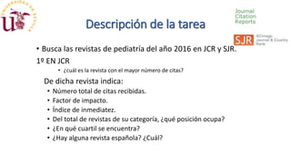 Este documento describe una tarea de búsqueda en revistas de pediatría en las bases de datos JCR y SJR para el año 2016. En JCR, la revista con más citas fue Pediatrics, con 73,380 citas totales, un factor de impacto de 5.705 e índice de inmediatez de 1.036, ocupando la posición 3 de su categoría en el cuartil 1. La única revista española fue Anales de Pediatría. En SJR había 7 revistas españolas de pediatría, siendo Anales de Pediatría la