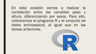 Este documento describe un análisis de correlación entre el peso y la altura de hombres y mujeres utilizando datos de salud. Se filtran los datos por sexo y se realizan pruebas de normalidad, diagramas de dispersión, matrices de correlación y pruebas de correlación de Spearman. Los resultados muestran una correlación positiva débil entre el peso y la altura tanto en mujeres como en hombres.