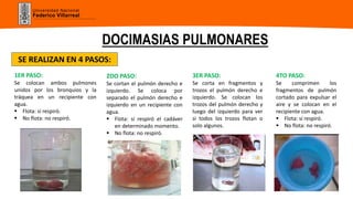 El documento describe los cuatro pasos del proceso de docimasia pulmonar, que es una prueba realizada en autopsias para determinar si un cadáver respiró. El primer paso implica colocar los pulmones unidos en agua para ver si flotan. Los pasos siguientes involucran cortar y probar los pulmones derecho e izquierdo por separado y en trozos para establecer con más precisión si respiraron.