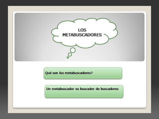 Este documento resume información sobre navegadores, buscadores, metabuscadores e repositorios de información de Internet. Explica los objetivos principales de conocer los navegadores más usados, establecer los buscadores principales, entender qué son los metabuscadores y conocer los repositorios de información. El resumen también incluye una breve descripción de cada tema cubierto en el documento.