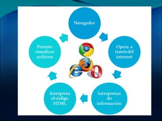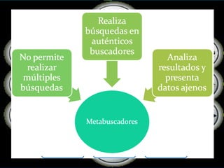Este documento describe los diferentes tipos de navegadores web, buscadores y repositorios de información. Identifica varios navegadores populares como Firefox, Chrome, Opera e Internet Explorer y buscadores como Google, Yahoo y Bing. También menciona metabuscadores como Scirus que permiten buscar en varios motores de búsqueda a la vez y repositorios como Wikipedia que almacenan y comparten información de forma gratuita.