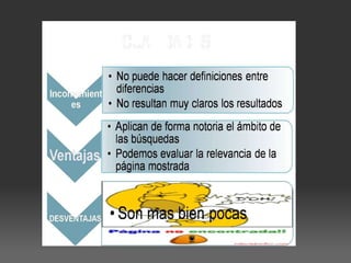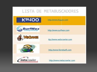 Este documento resume información sobre navegadores, buscadores, metabuscadores y repositorios de información de Internet. Explica los objetivos principales de conocer los navegadores más usados, establecer los buscadores principales, entender qué son los metabuscadores e identificar los repositorios de información. El resumen incluye una breve descripción de los temas cubiertos en el documento.