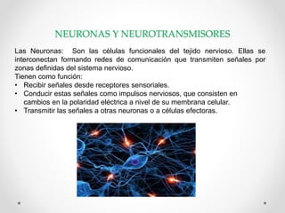 Este documento describe las neuronas y los neurotransmisores. Explica que las neuronas son las células del sistema nervioso que se comunican mediante impulsos nerviosos y neurotransmisores. Describe las diferentes clases de neuronas y sus partes. También explica cómo funcionan los neurotransmisores como la acetilcolina, la dopamina y el GABA en la transmisión de señales entre neuronas.