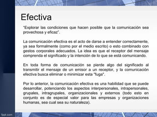 Este documento trata sobre conceptos clave de la comunicación efectiva como la comunicación formal e informal, ascendente y descendente, interpersonal y afectividad. También aborda conceptos como el grado de madurez y pertenencia de un equipo, la ética, la moral y la conciencia grupal. En resumen, ofrece una introducción a diferentes temas relacionados con la comunicación organizacional y el trabajo en equipo.