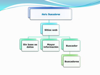El documento lista los navegadores más populares (Firefox, Internet Explorer, Chrome, Safari y Ópera) junto con sus respectivas direcciones URL, así como también los principales motores de búsqueda (Google, Yahoo, Bing, Ask y Altavista) y meta buscadores (Dogpile, Ixquick, Metacrawler, Monstercrawler y Kartoo), proporcionando la información de contacto de cada uno.