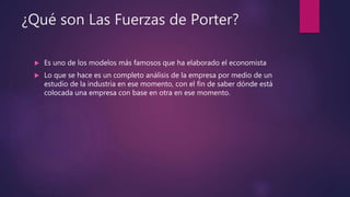 El documento describe el modelo de las Cinco Fuerzas de Porter, que analiza la industria de una empresa mediante cinco fuerzas competitivas: la amenaza de nuevos competidores, el poder de negociación de los proveedores, el poder de negociación de los clientes, la amenaza de productos sustitutos y la rivalidad entre los competidores existentes. El objetivo del modelo es calcular la rentabilidad de una empresa y proyectar su valor y desempeño futuro mediante el análisis de estas cinco fuerzas.
