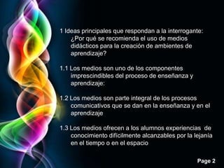 El documento habla sobre los recursos educativos y medios didácticos para crear ambientes de aprendizaje. Explica que los medios son componentes importantes en los procesos de enseñanza y aprendizaje ya que ofrecen experiencias que de otra forma serían inalcanzables y potencian habilidades intelectuales. Describe diferentes tipos de medios como los pretecnológicos, audiovisuales, informáticos y las tecnologías de la información.