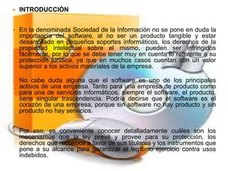 Este documento trata sobre la protección jurídica del software. En primer lugar, introduce el tema y define el software. Luego, presenta el marco teórico, abarcando conceptos como las características, clases y elementos del software, así como su naturaleza jurídica y mecanismos de protección. Finalmente, analiza la relación del software con los derechos de propiedad intelectual y la solicitud de otorgamiento de derechos de autor para un software.