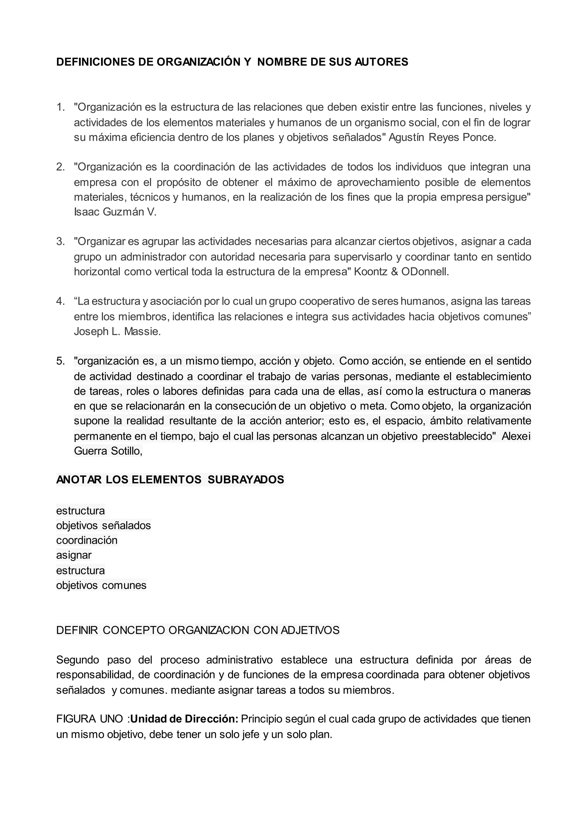 El documento presenta definiciones de organización de diferentes autores, resaltando elementos como estructura, objetivos, coordinación y asignación de tareas. Luego, define organización como un proceso que establece una estructura coordinada para alcanzar objetivos señalados y comunes mediante la asignación de funciones. Finalmente, describe diferentes tipos de organizaciones como la militar, funcional, lineal-funcional, staff, matricial y por comités.