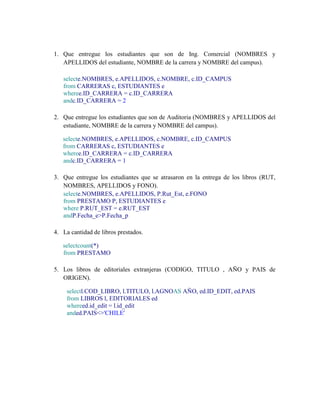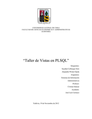 Este documento describe un taller sobre vistas en PL/SQL. Incluye ejemplos de consultas SQL y la creación de vistas para obtener datos de una base de datos de una universidad. Algunas vistas muestran datos de estudiantes, libros prestados, y la relación entre estudiantes, libros y funcionarios. Otras vistas cuentan el número de estudiantes por carrera, campus, ciudad y el número de préstamos atrasados y activos.