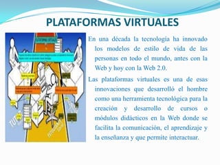 El documento describe las plataformas virtuales como herramientas tecnológicas para la creación de cursos en la web que facilitan la comunicación y el aprendizaje. Explica que se centrará en tres aplicaciones principales - WebCT, Blackboard y FirstClass - las cuales permiten añadir elementos interactivos como foros de discusión a los cursos en línea. Concluye que las plataformas virtuales tienen una variedad de utilidades para la enseñanza y el aprendizaje y que deben aplicarse más en la academia para aprovechar las innovaciones te