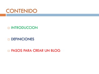 Este documento presenta los pasos para crear un blog como tarea de grupo en la asignatura de Comunicación Educativa en los Nuevos Espacios Tecnológicos. Incluye definiciones de blog, blogger y los pasos para crear un blog. El objetivo es que los estudiantes creen su propio blog al final de la sesión.