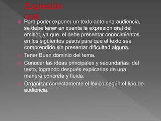 Para exponer un texto ante una audiencia, el emisor debe tener buen dominio del tema, conocer las ideas principales y secundarias del texto y organizar el léxico según el tipo de audiencia. Para lograr la comprensión del texto, se deben conocer las ideas primarias y secundarias, palabras claves y el contexto, además de las reglas gramaticales. Un texto debe tener un tema central fácil de encontrar y entender por el lector, y las ideas deben estar relacionadas de manera lógica para que el texto sea coherente
