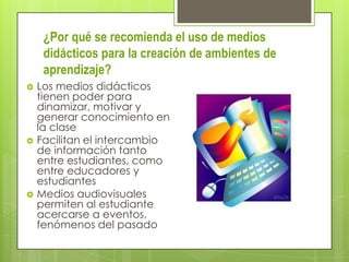 El documento describe los beneficios de usar medios didácticos para crear ambientes de aprendizaje, incluyendo que dinamizan y motivan a los estudiantes, facilitan el intercambio de información, permiten experimentar eventos del pasado, desarrollan habilidades, y comunican ideas. También discute los riesgos del uso inseguro de Internet y ofrece recomendaciones para un uso seguro.