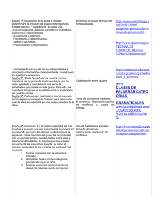 Este documento describe una unidad didáctica sobre análisis morfológico de categorías gramaticales para estudiantes de primer año de ESO. Los estudiantes trabajarán en grupos para crear resúmenes de las categorías gramaticales y luego participarán en un concurso para identificarlas en oraciones. El proyecto implica el desarrollo de habilidades lingüísticas, de trabajo en equipo y resolución de conflictos.