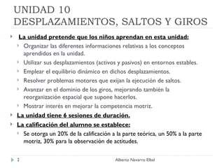 La unidad pretende que los estudiantes aprendan sobre desplazamientos, saltos y giros a través de 6 sesiones. En la sesión 5, los estudiantes trabajarán en grupos para elegir un deportista famoso, pensar preguntas sobre él, y crear una entrevista ficticia que publicarán como una noticia de periódico. La tarea será evaluada basada en la creatividad, expresión escrita, y capacidad de los estudiantes para encontrar y representar información relevante.