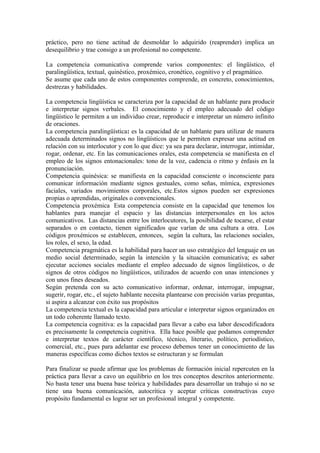 Este documento describe las competencias comunicativas y sus componentes. Explica que la capacidad de comunicación es fundamental para el avance humano y que el lenguaje permite la historia, conocimiento y comprensión. Describe las competencias lingüística, paralingüística, quinésica, proxémica, pragmática y textual como habilidades comunicativas esenciales. Finalmente, enfatiza que ser competente requiere equilibrar conocimientos, habilidades y actitudes a través de la comunicación y aceptación de comentarios.