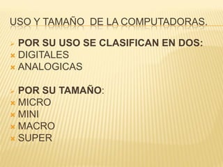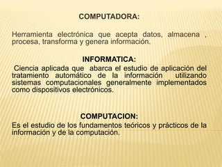 Las computadoras son herramientas electrónicas que procesan datos y generan información. La informática es la ciencia que estudia la aplicación del procesamiento automático de información usando sistemas computacionales. La computación es el estudio teórico y práctico de la información y el procesamiento de datos. Las TIC son herramientas e instrumentos que facilitan obtener, procesar y enviar información de manera sencilla e instantánea con múltiples aplicaciones.