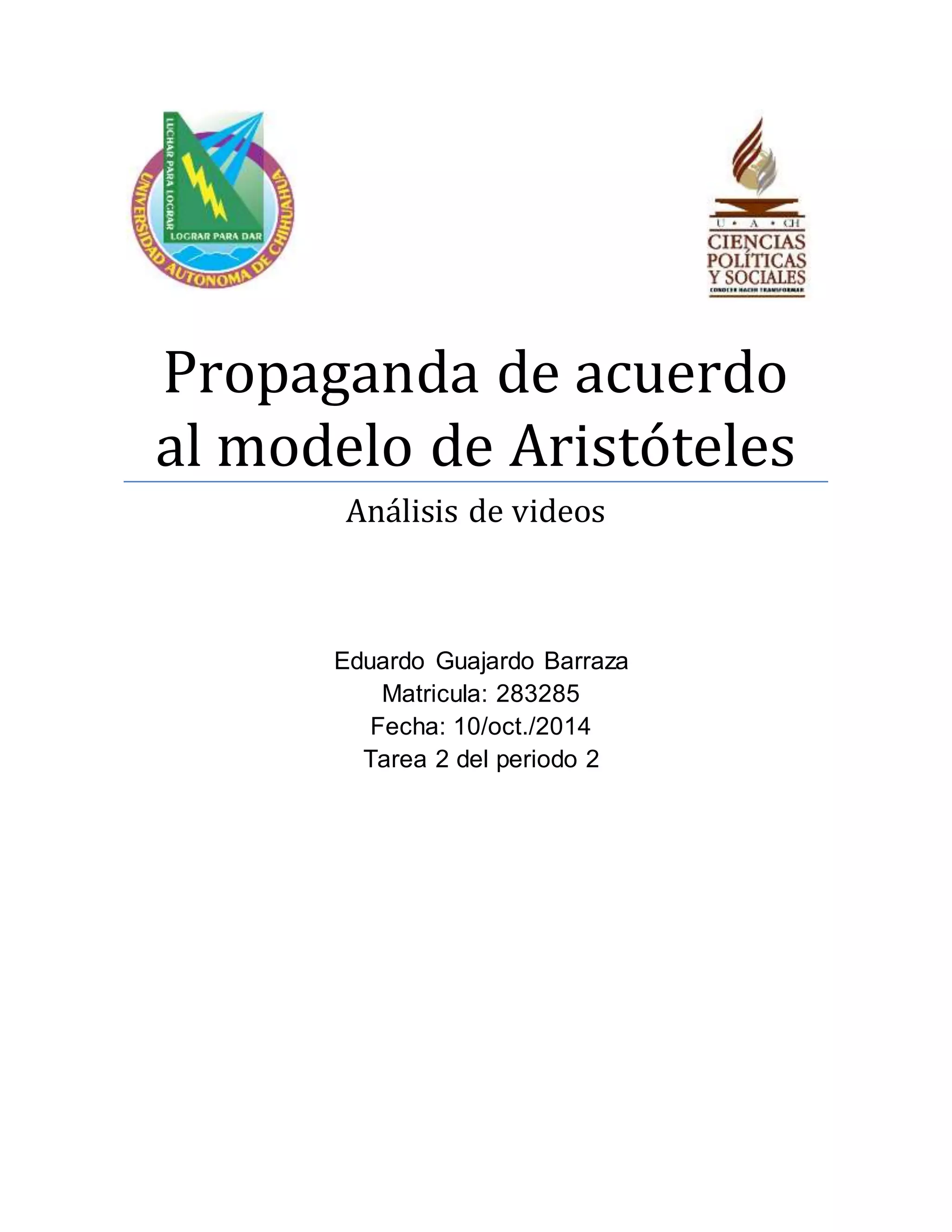 Este documento resume tres videos analizados según el modelo de propaganda de Aristóteles. El primer video sobre el acoso escolar usa la ética ("ethos") al generar sentimientos morales en los padres. El segundo video sobre los estereotipos de belleza usa la lógica ("logos") al presentar argumentos con evidencia. El tercer video sobre la discapacidad usa la emoción ("pathos") al hacer que el público sienta empatía.