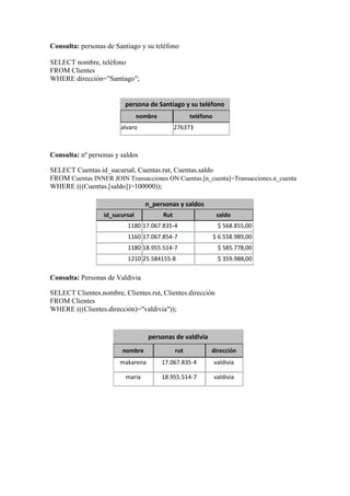 Este documento contiene varias consultas SQL realizadas a una base de datos bancaria. Las consultas incluyen obtener información como personas de Santiago y su teléfono, número de personas y sus saldos mayores a $100.000, personas de Valdivia, ordenar clientes por nombre y monto, saldos mayores a $200.000, promedios de saldos, nombre de sucursales y saldos totales por sucursal.