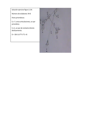 Este documento contiene las soluciones a varios ejercicios sobre mecanismos. Resume cuatro mecanismos con sus componentes y grados de libertad, incluyendo un mecanismo con una cuchara accionada por dos cilindros. Calcula los grados de libertad de cada mecanismo usando la fórmula de Gruebler.